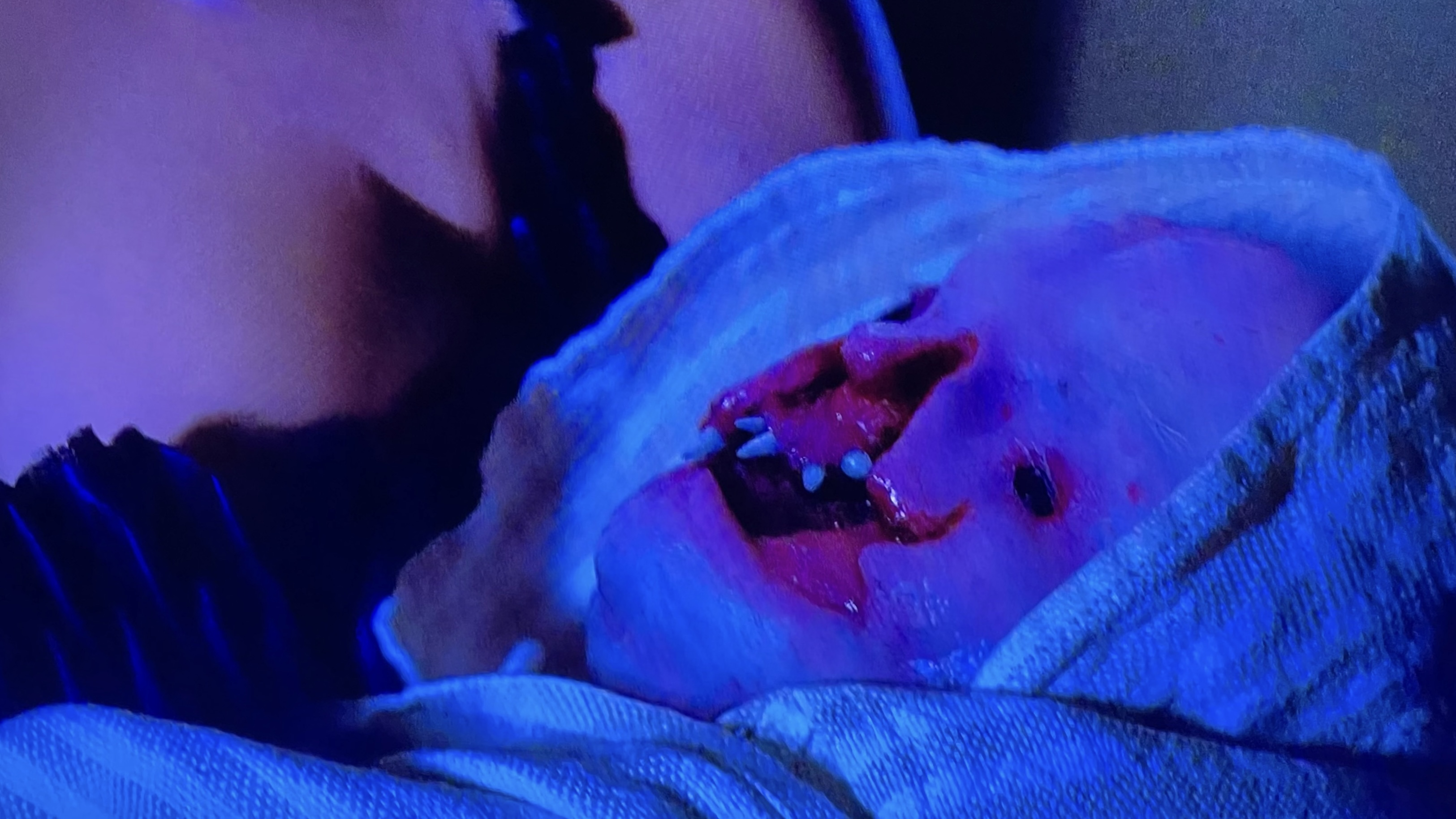 Sein Gesicht und sein Kopf sind bauchig und ungeformt, mit einer Gaumenspalte, die sich weit über die Nasennebenhöhle hinaus erstreckt und mit mehreren scharfen Zähnen um seinen Rachen herum gefüllt ist. Er hat keine Nase, und seine Augen sind weit und ohne Pupillen und spiegeln die Gesichter seiner Opfer in purer Schwärze. Er scheint extrem blutrünstig in der Natur zu sein und jeden anzugreifen, der seinen Schlaf in den dunkelsten Winkel des Hotels stört.